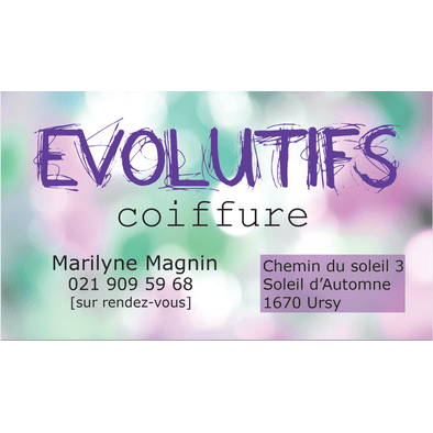 Marilyne vous accueil dans une ambiance chalereuse et conviviale au Salon Evolutifs Coiffure. Indépendante depuis bientôt 21 ans et titulaire d'un brevet fédéral. Hommes, femmes et enfants. Services à prix très attractifs.